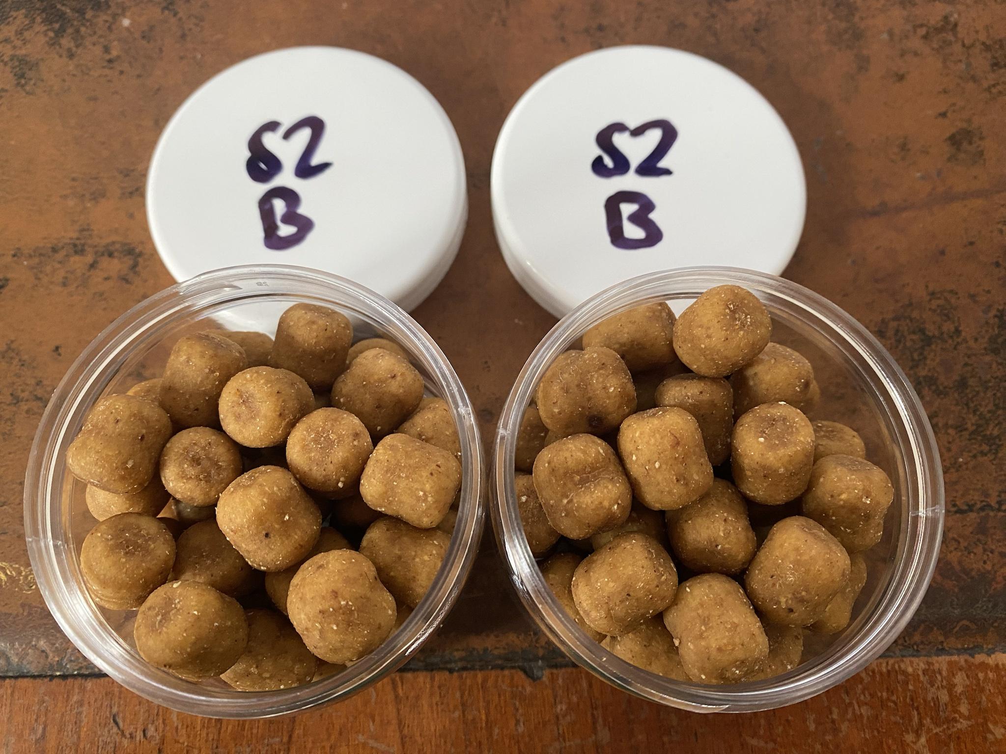 What I am going to share with you today, is such a simple thing to do when making your own freezer bait at home. You do not need to buy any expensive additives, you do not need to change your favourite boilie recipe. With just one extra ingredient, time, you are going to immeasurably improve the bait that you make. In the photograph, there are two S2 crushed cork pop ups, side by side. One, is slightly darker than the other. The darker one, also smells slightly different to the human nose. Despite being made with identical ingredients, identical base mix and liquids, all from exactly the same batch... One of them, is slightly darker than the other. The darker hook bait itself, has an almost olive smelling twang to it. If you tasted the two pastes before they were rolled, the darker one has a much richer and more intense taste to it. But they were made with identical ingredients. The darker one, is in fact, far more effective... It will actually catch you more carp, than the lighter one will. The lighter one, has been made just for the purposes of what I am writing now. Just to show you a visible difference, which you can see with your own eyes. The lighter, less effective coloured one has been made, in exactly the same way in which you have always been told to roll your boilies, since you first took up carp fishing. In exactly the same way as freezer baits are made everywhere that carp fishing is practiced. Eggs in a bowl, add your liquid additives, add your powders form into a paste, put into a bag for ten minutes and roll. Standard procedure.