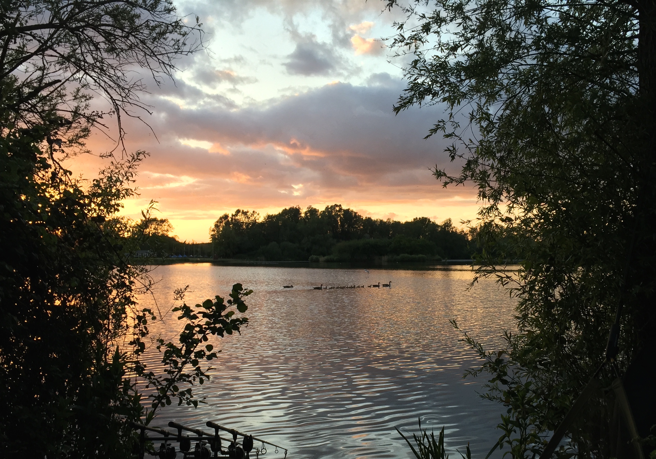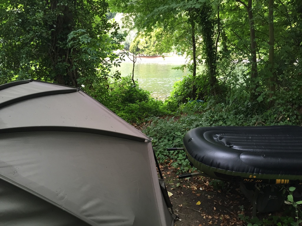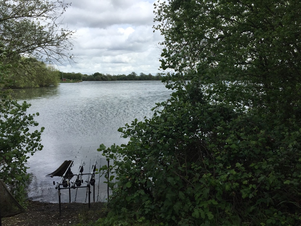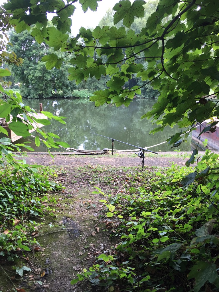 The undercut previously spoken about was just out of shot on the left. I had to cast a bare lead above those small pads into the low branches. Then sneak round with a leader with rig and lead attached. A pair of scissors and a landing net pole. Once I had retrieved the lead and had the bare line in my hand, it was then a case of manoeuvring the line along the bank at water level, under the over hangs. Once into the right position, with the rig attached it was a case of feeding the lead hanging off the crook of the landing net pole under the bank itself.