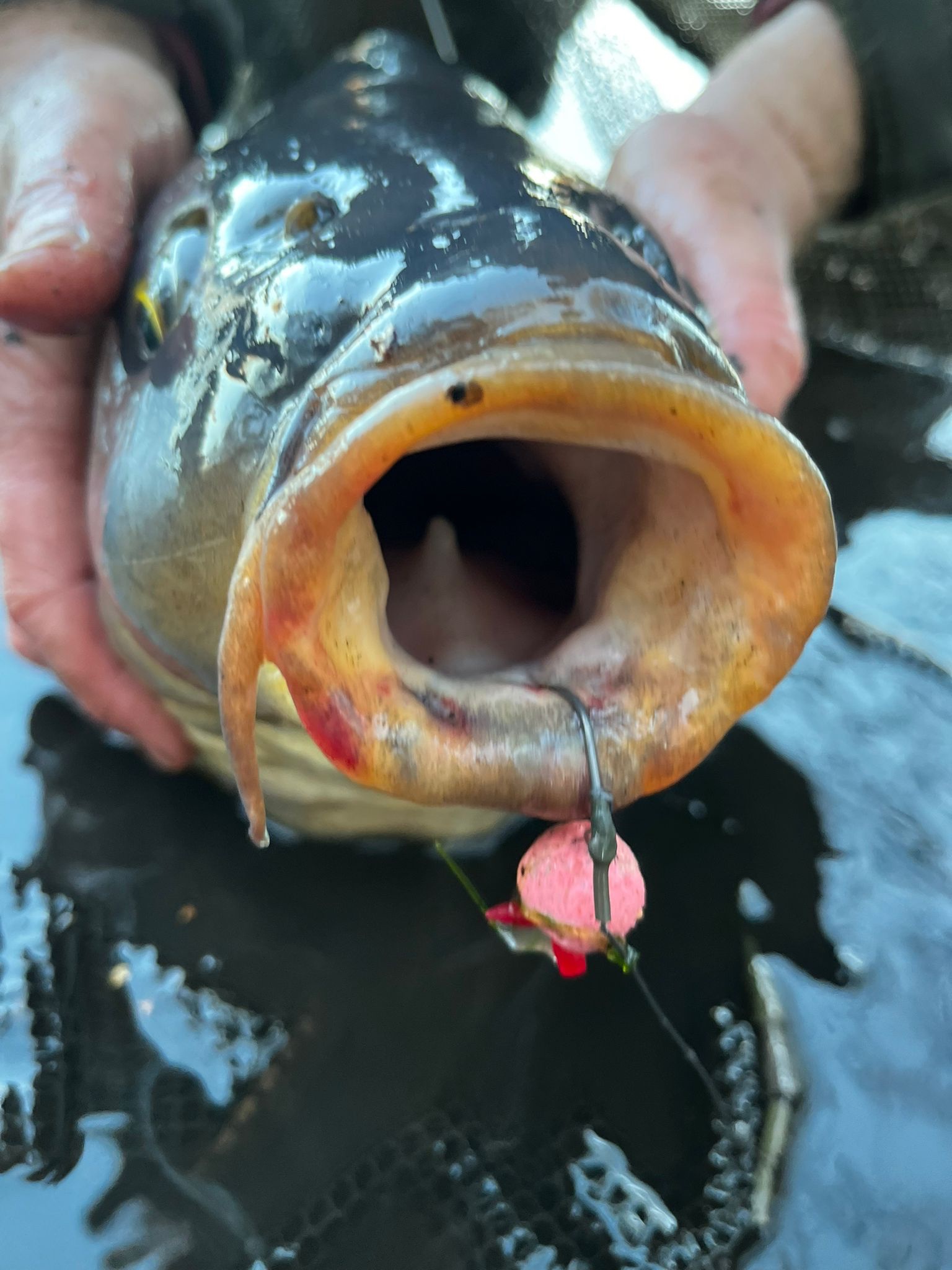 Walthamstow, January 2012. Lake is frozen solid beyond the fishes head. I had to wait hours that morning for it to thaw enough to get the rods out into open water to the right. I had put out a five kilo bag of pre soaked T&M the evening before. I had five carp this day in three hours, including a brace of mid 30's. S2 on long running naked chods. I was the only person on the entire complex. It was absolutely bitter. Classic old Stow mirror, with a big underslung mouth.