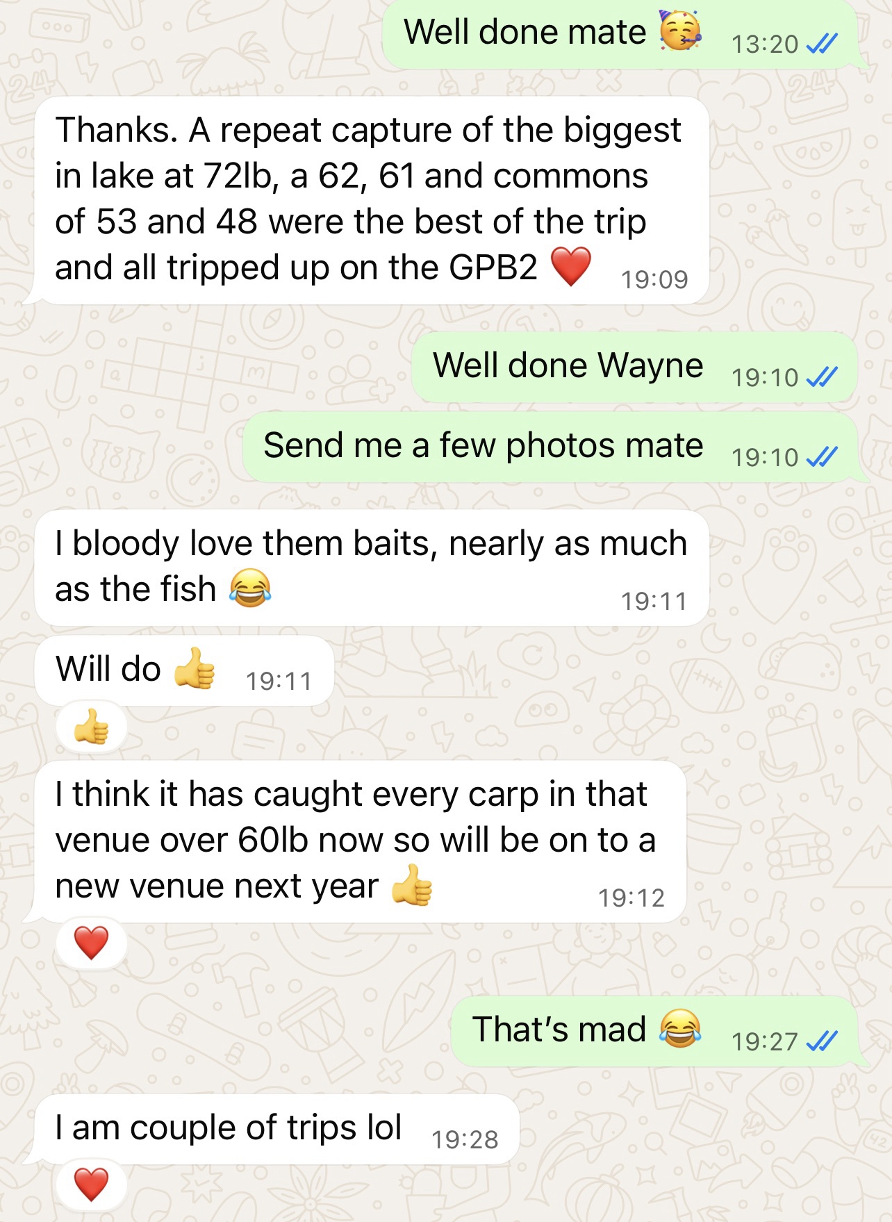 Me and Wayne have had our problems. Reality? Wayne purchased one tub of GPB1 from us and caught loads of pukka fish on that single tub. He sent me the photos. I unwisely did not use them, as I did not like the way he was treating another forum member who's mate had died of Covid. I'm not the old bill, should have just posted Waynes photos. That was five years ago now. That led to mucho mucho trouble in various forms that was still going on until very recently with him and Braders. Do I give a single feck? Not at all.