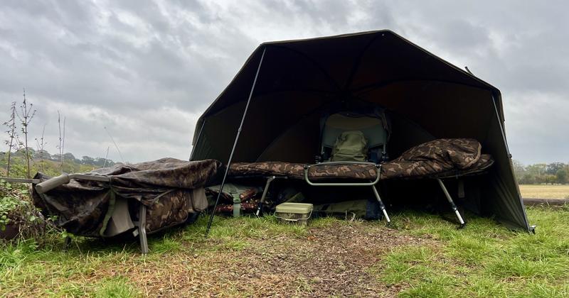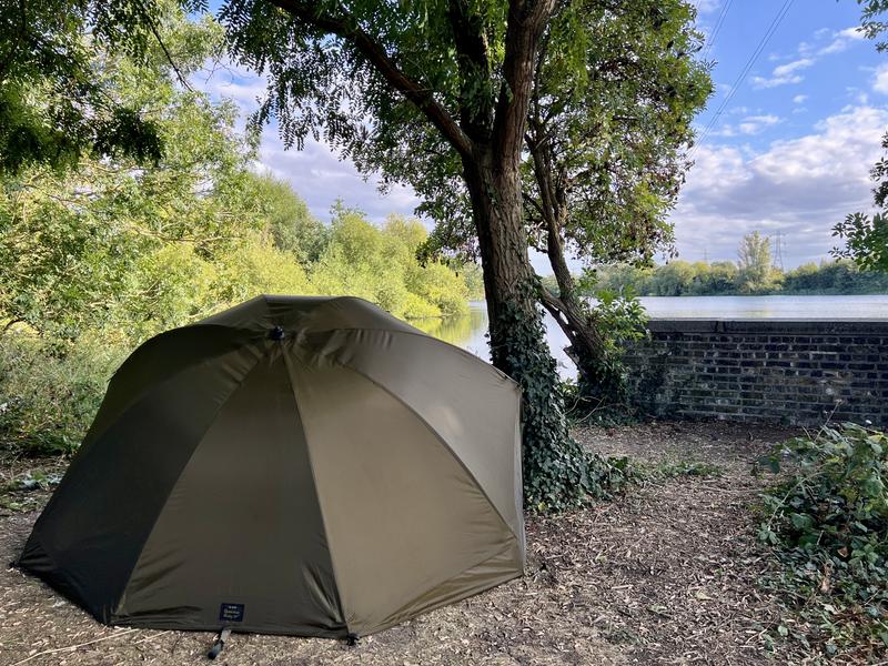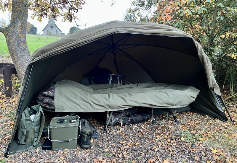 I've got a Fox 60" brolly (current model) and it's heavy but the coverage is excellent with space for a solar dura sore wide bed chair on over nighters and tons of room on days with me a bag and a solar sofa chair under it.